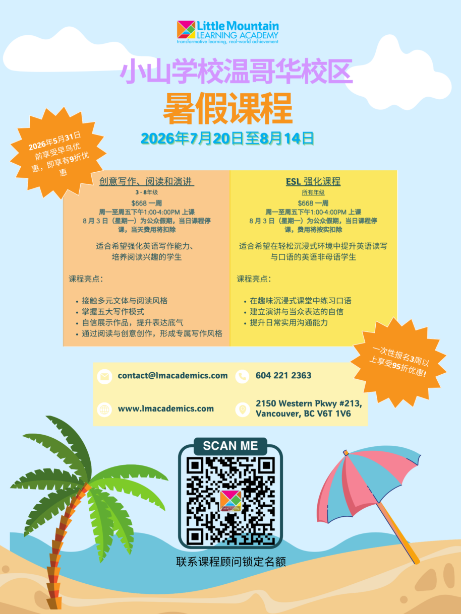 Little Mountain Learning Academy 小山学校为小学 、初中和高中各个阶段的学生开设了不同类型的强化课程。